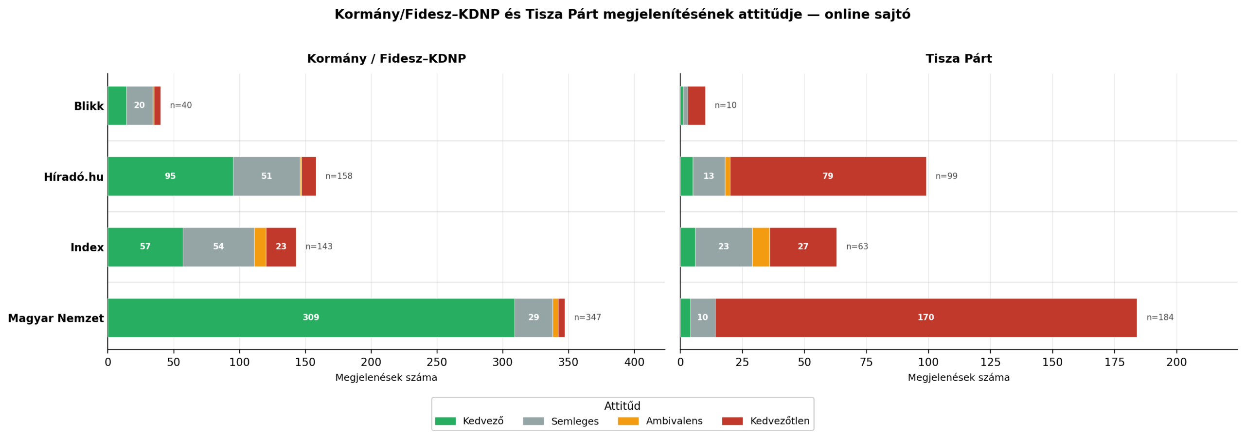 A szereplőkkel kapcsolatos attitűdök szemléltetésére a két versengő pártot képviselő politikusok összesített adatait mutatjuk be. A “Kormány/Fidesz-KDNP” és a “Tisza Párt” gyűjtőkategóriában az összes olyan megjelenés látható, mely a kormányhoz és/vagy annak tagjaihoz, az egyes pártokhoz és/vagy azok tagjaihoz köthetők a szereplők szintjén.