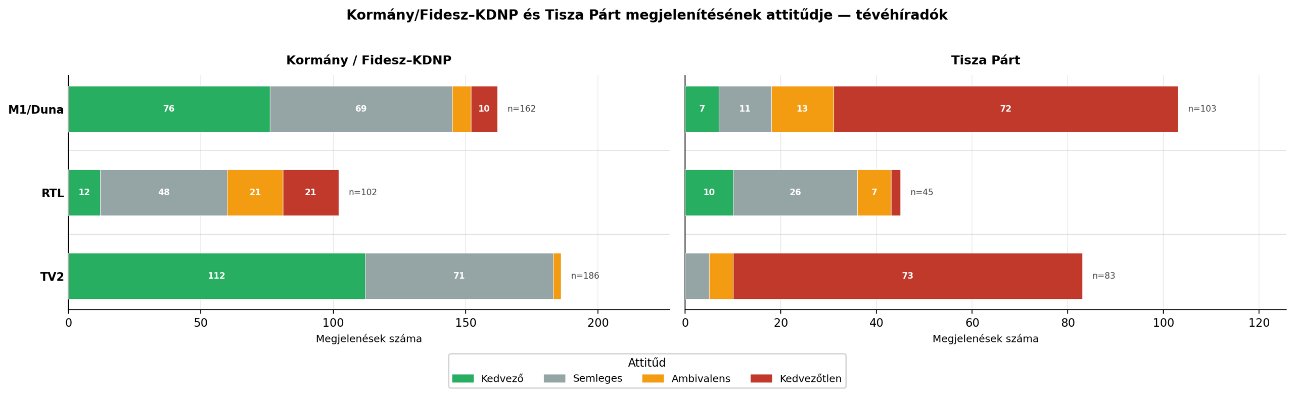 Egészen elképesztő különbségek rajzolódnak ki az egyes híradókban a két nagy erő megjelenítésében – kivétel ez alól az RTL híradó, amelyben mindkét párthoz kapcsolódóan a semleges megszólalások dominálnak, valamennyivel, de nem kirívóan kritikusabb attitűd jellemzi a kormánypártok irányába. A közmédia és a TV2 viszont szinte ellentétes póluson kezeli a két pártot, a TV2-n például a Fidesz-KDNP egyetlenegy negatív, a Tisza Párt pedig egyetlenegy pozitív megjelenést sem kapott (!).