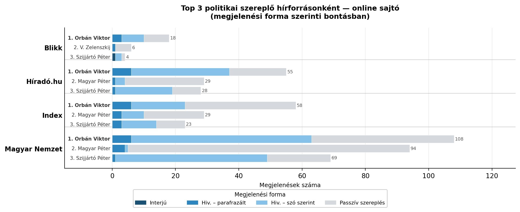 A hírportálok közül – és a vizsgált hírforrások mindegyikét tekintve is – egyedül a Blikken nem került be Magyar Péter a top 3 politikai szereplő közé. A többi online sajtóban az Orbán-Magyar-Szijjártó hármas vezeti a szereplők toplistáját, ebben a sorrendben.
