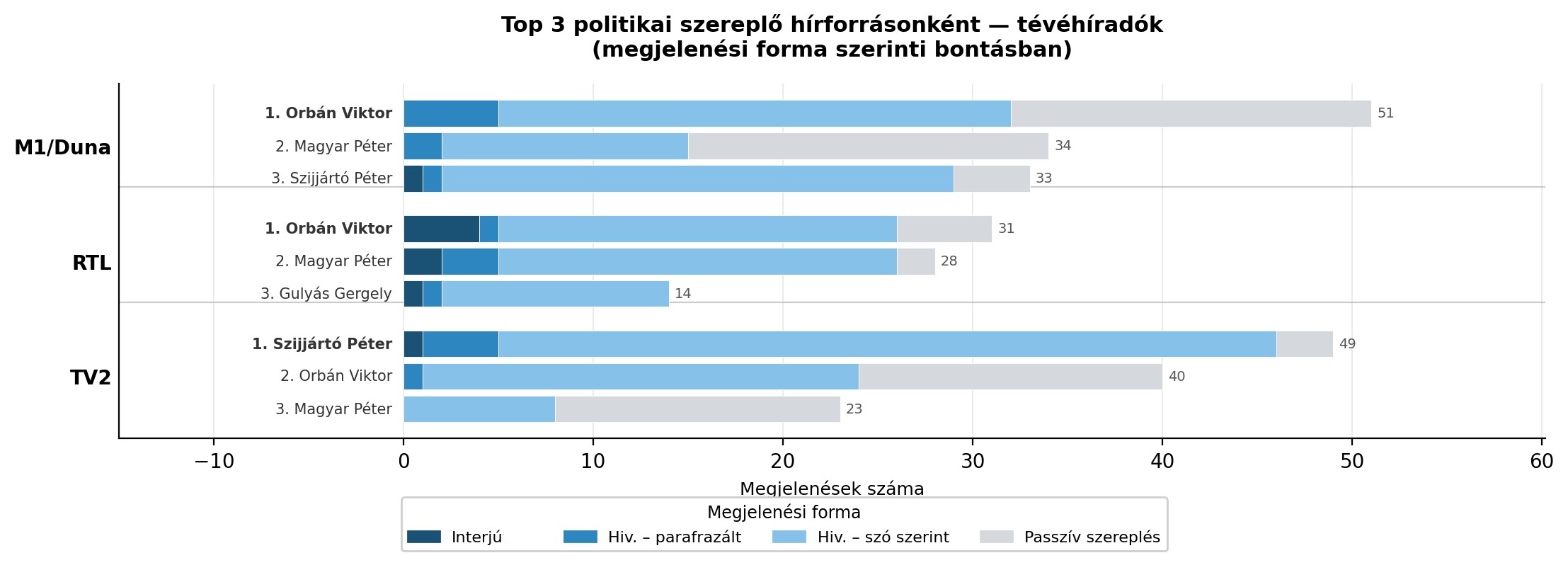 A vizsgált televízió-híradók három leggyakoribb szereplőjét tekintve az látható, hogy Orbán Viktor és Magyar Péter mindhárom csatornán szerepel a top 3-ban, a két kormányközeli médiumban rajtuk kívül Szijjártó Péter, a kormánykritikus RTL-nél viszont Gulyás Gergely bukkant fel a legtöbb hírelemben.