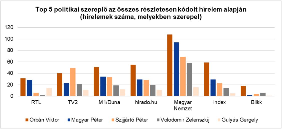 A vizsgált hét hírforrás részletesen kódolt híreinek összesített adatait tekintve Orbán Viktor, Magyar Péter, Szijjártó Péter, Volodimir Zelenszkij és Gulyás Gergely szerepeltek a legtöbb híranyagban. A szereplők megjelenését hírelemenként egyszer kódoltuk, tehát a számok arra vonatkoznak, hogy a vizsgált tartalmak közül egy-egy szereplő hány hírelemben szerepelt.