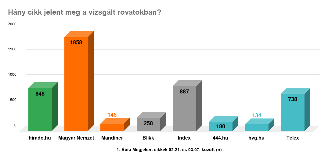 A sorozat első részében a nyolc online portálon február 21. és március 7. között megjelent cikkeket elemezzük, vagyis a kampányidőszak első két hetét vizsgáltuk meg. Az első két hétben kicsit több mint 5000 cikk jelent meg a híroldalak általunk vizsgált rovataiban. A pontos számok az első ábrán láthatók.