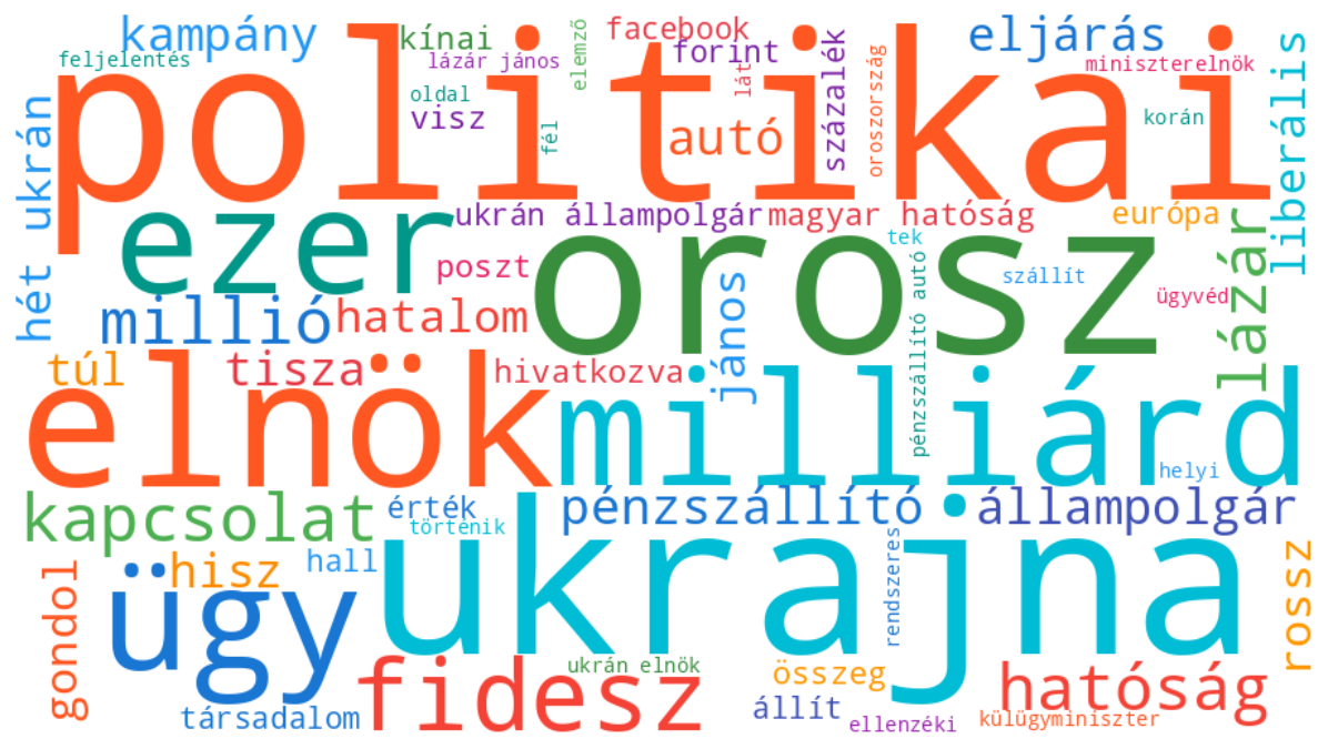A topikmodellezés nem tiszta témákat azonosít, vagyis más szálak is felbukkanhattak azokban a cikkekben, melyeket a modell egy főtémába sorolt. Például a hvg.hu oldalán is jelentek meg Ukrajnáról szóló hírek, ám ezek egy másik, dominánsabb téma részei. A hvg.hu-n megjelenő arányok eltérnek a többi portálon tapasztalhatótól, a többi független médiumhoz képest is lényegesen más képet mutatnak. Az újság cikkei két nagy téma köré szerveződnek: Kormány-ellenzék narratíva (34%) és Közel-Kelet (31%). Ezt azonban erősen árnyalja a hvg.hu szófelhője, melyen az egyes témákban leggyakrabban megjelenő szavak láthatók. A szófelhőn látható, hogy a modell ebbe a témába sorolt több Ukrajnát, illetve az ukrán pénzszállító lefoglalását is említő cikket, mivel ezek témája az algoritmus alapján jobban illett a kampánytémákhoz, mint egy önálló ukrán-kategóriába. Ahogy a módszertani kitekintőben is írtuk, minden portál saját, független modellt kapott, tehát az adott főtémák oldalanként eltérőek.