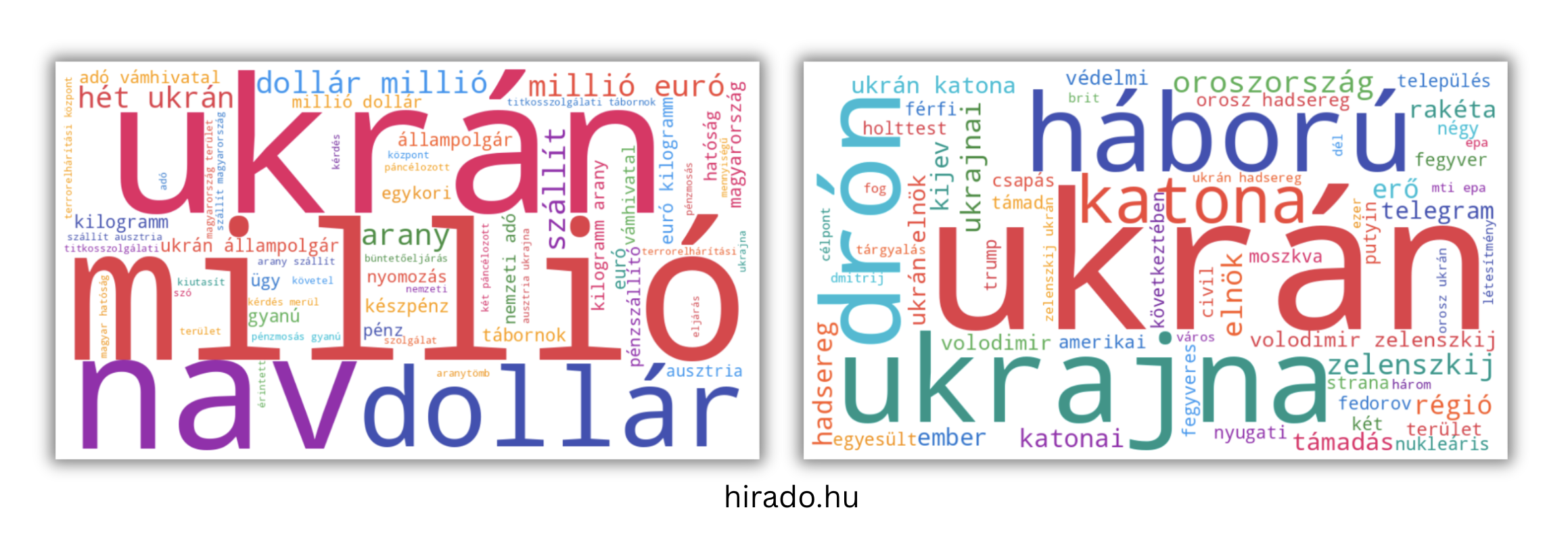 A főtémák (például Ukrán háború, Közel-Kelet, Energiapolitika, stb.) néhány esetben több altémára bonthatók. Ezt jól szemlélteti például a hirado.hu-n megjelent ukrajnával kapcsolatos hírek. A közszolgálati média egyrészt beszámolt a fronteseményekről, másrészt a letartóztatott ukrán pénzszállítóról. Ezek tehát egy főtémába tartoznak, ahogy az első ábrán látható, a leggyakrabban megjelenő szavak vizsgálatával azonban felfedezhető a különbség. Ezt mutatja meg az 4. ábra.