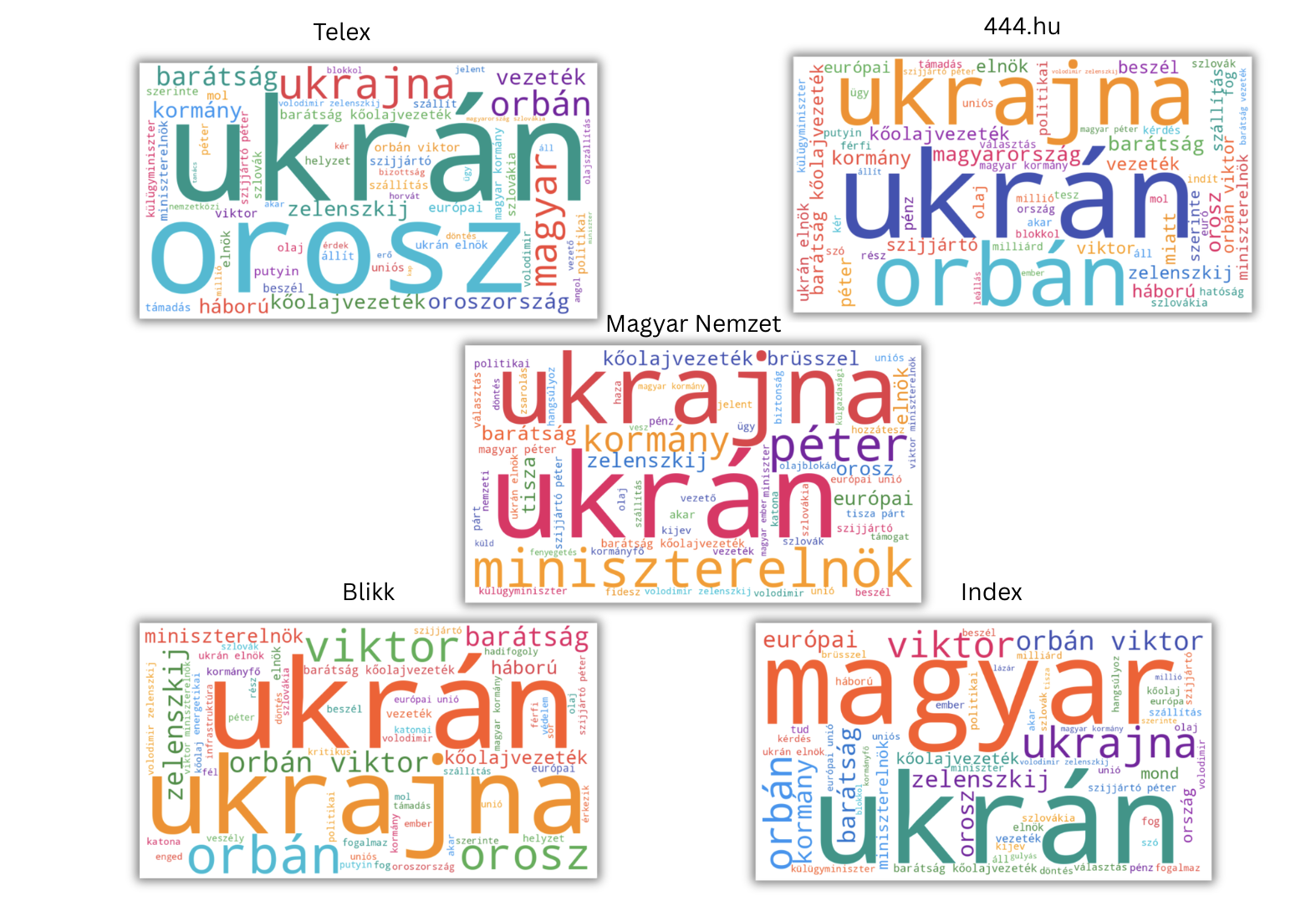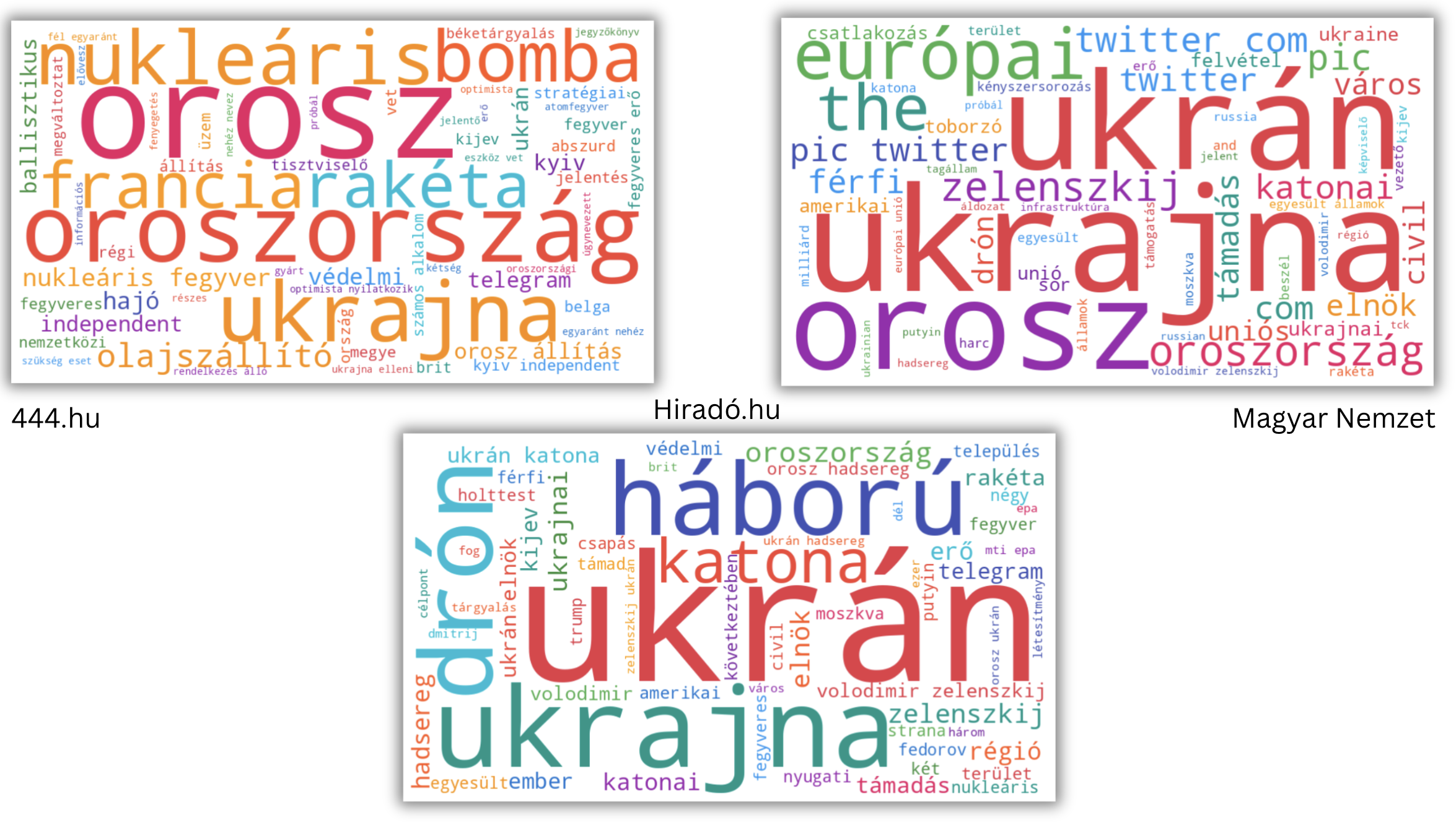 Ezek a cikkek, ahogy a szófelhőkön is látható, kifejezetten a külpolitikai eseményekre fókuszálnak, belpolitikai vonatkozás nélkül. A szófelhőkből a forráshasználatra is kapunk egy utalást: a 444.hu cikkeiben a Kyiv Independent szerepel nagy számban, míg a hirado.hu oldalán az MTI fordul elő gyakran. A Magyar Nemzet különutasként a Twittert említi a legtöbbször. Azt, hogy a portálok milyen forrásokat használnak, egy következő elemzésben részletesen is bemutatjuk majd.