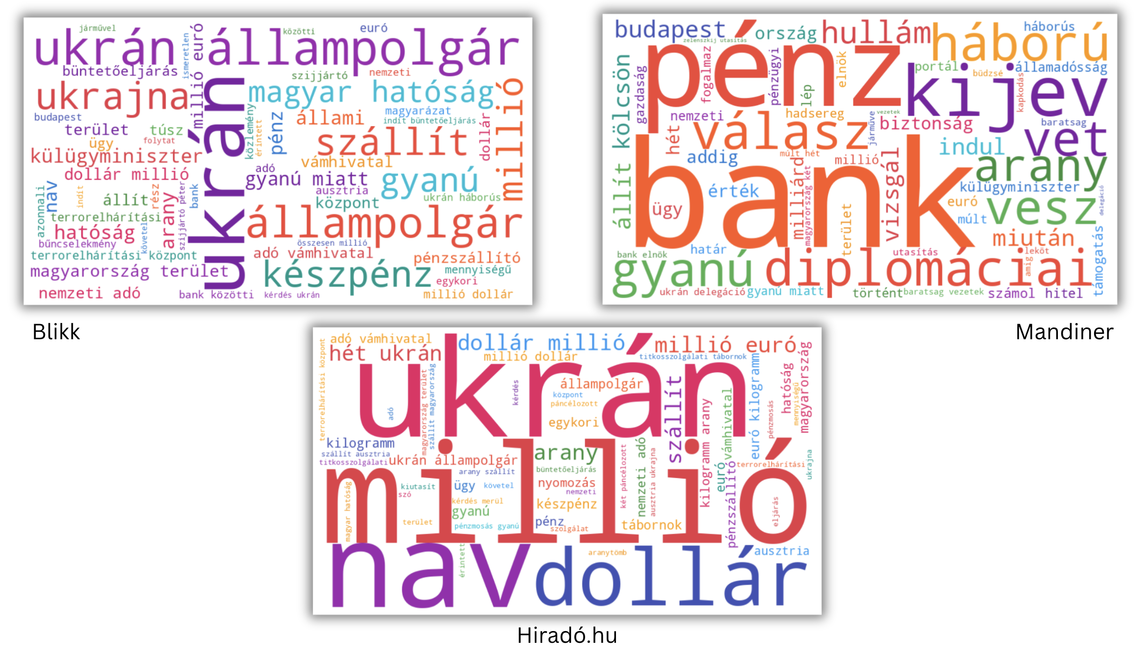 8. ábra Az ukrán pénzszállító eltérítése szófelhő portálonként (Blikk, Mandiner, hirado.hu)