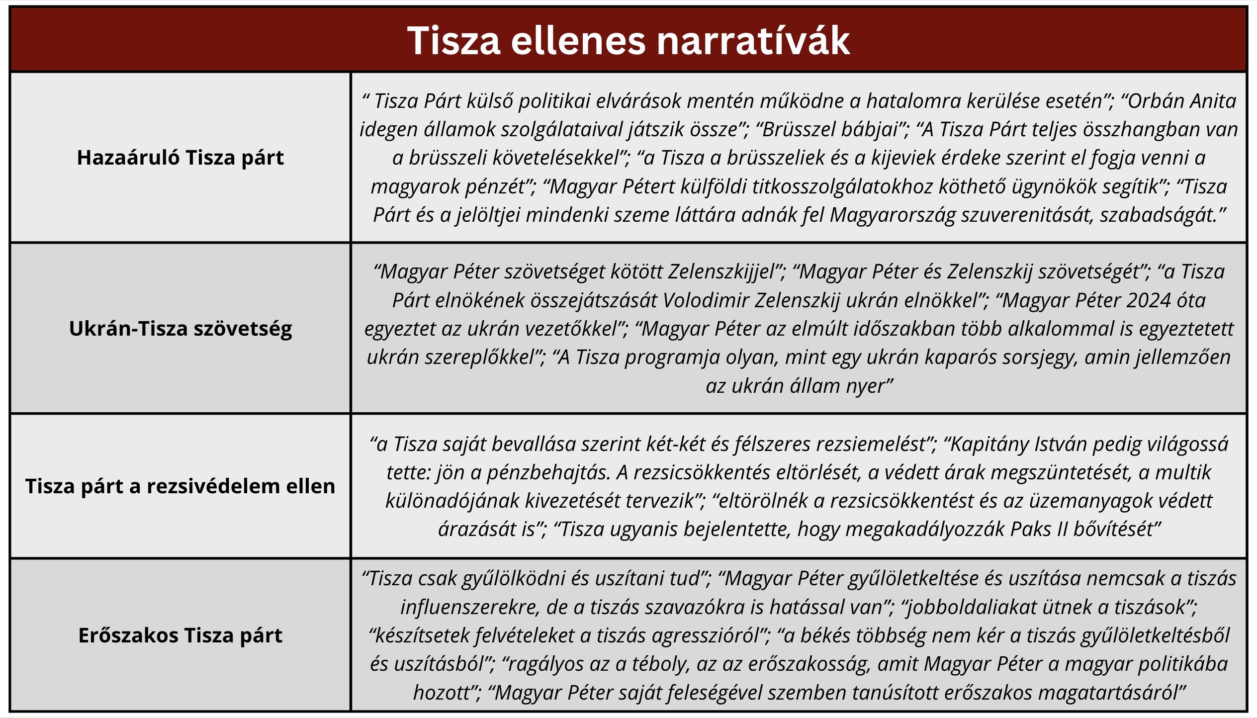 Magyar Péter és a Tisza Párt elleni üzenetek, például alkalmatlan, erőszakos vagy hazaáruló Tisza Párt, illetve a békét és a rezsicsökkentést veszélyeztető ellenzék.
