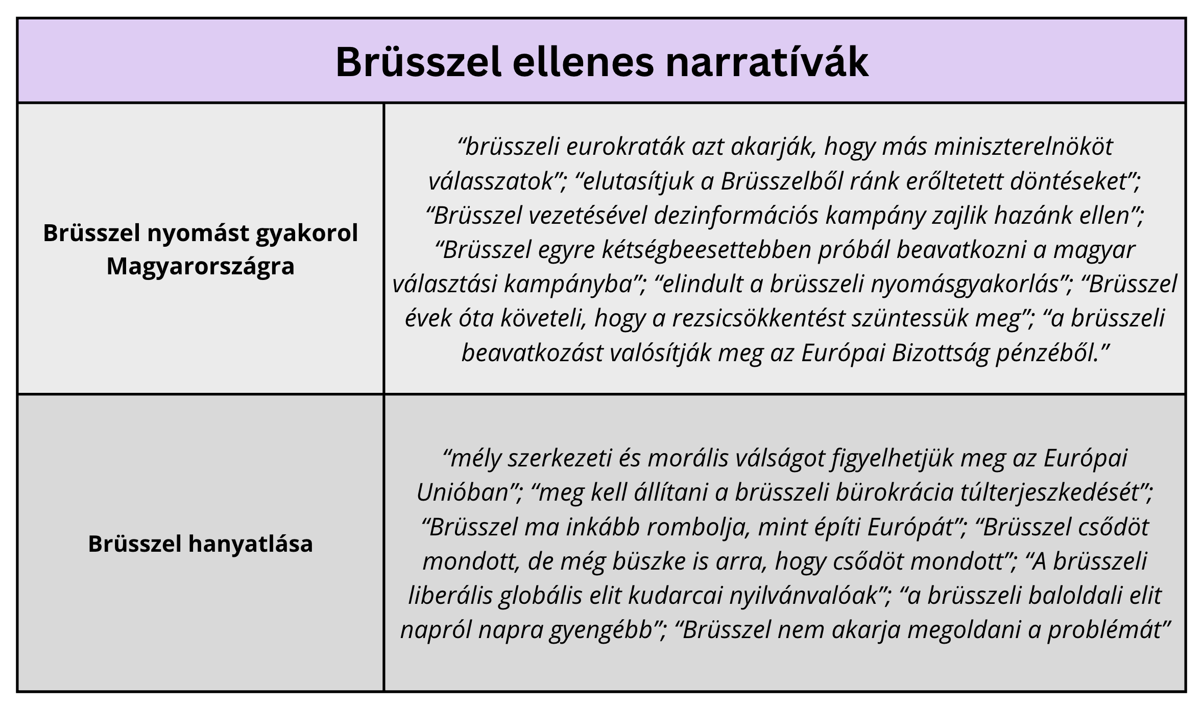 A brüsszeli ellenségképhez társított negatív narratívák, melyek közül a leghangsúlyosabb, hogy Brüsszel nyomást gyakorol Magyarországra, illetve beavatkozik a választásokba.