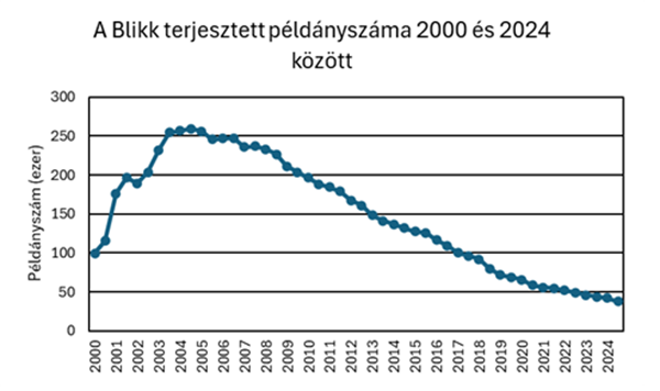 Mindettől függetlenül a Blikk nyomtatott kiadása nem kerülhette el azt a mélyrepülést, ami az iparág egészét jellemzi. Az alábbi grafikon az ezredforduló óta mutatja a példányszám csökkenését, ami önmagában is érzékelteti a helyzet súlyosságát, és érthetővé teszi a svájci tulajdonos döntését a kivonulásról.